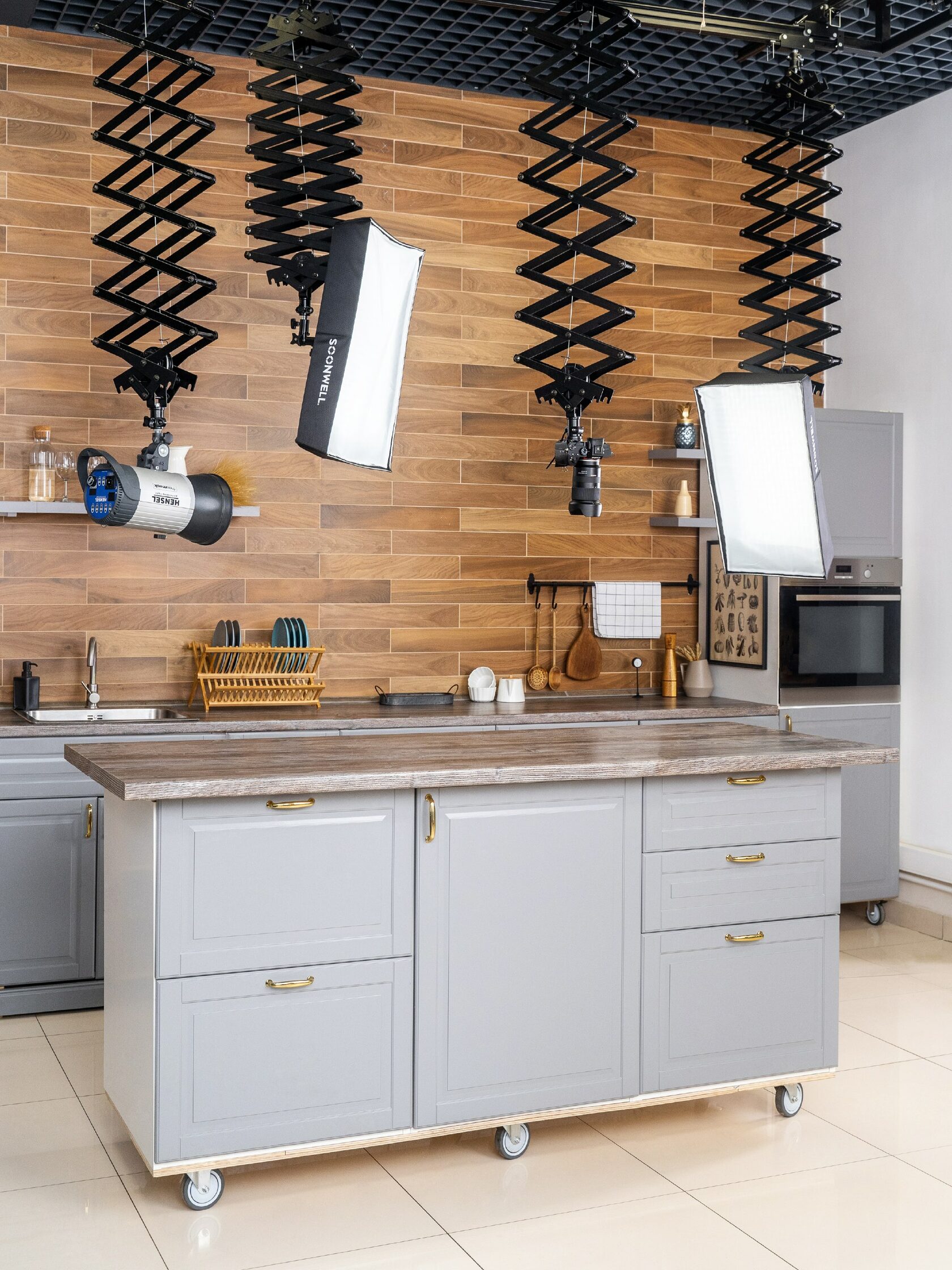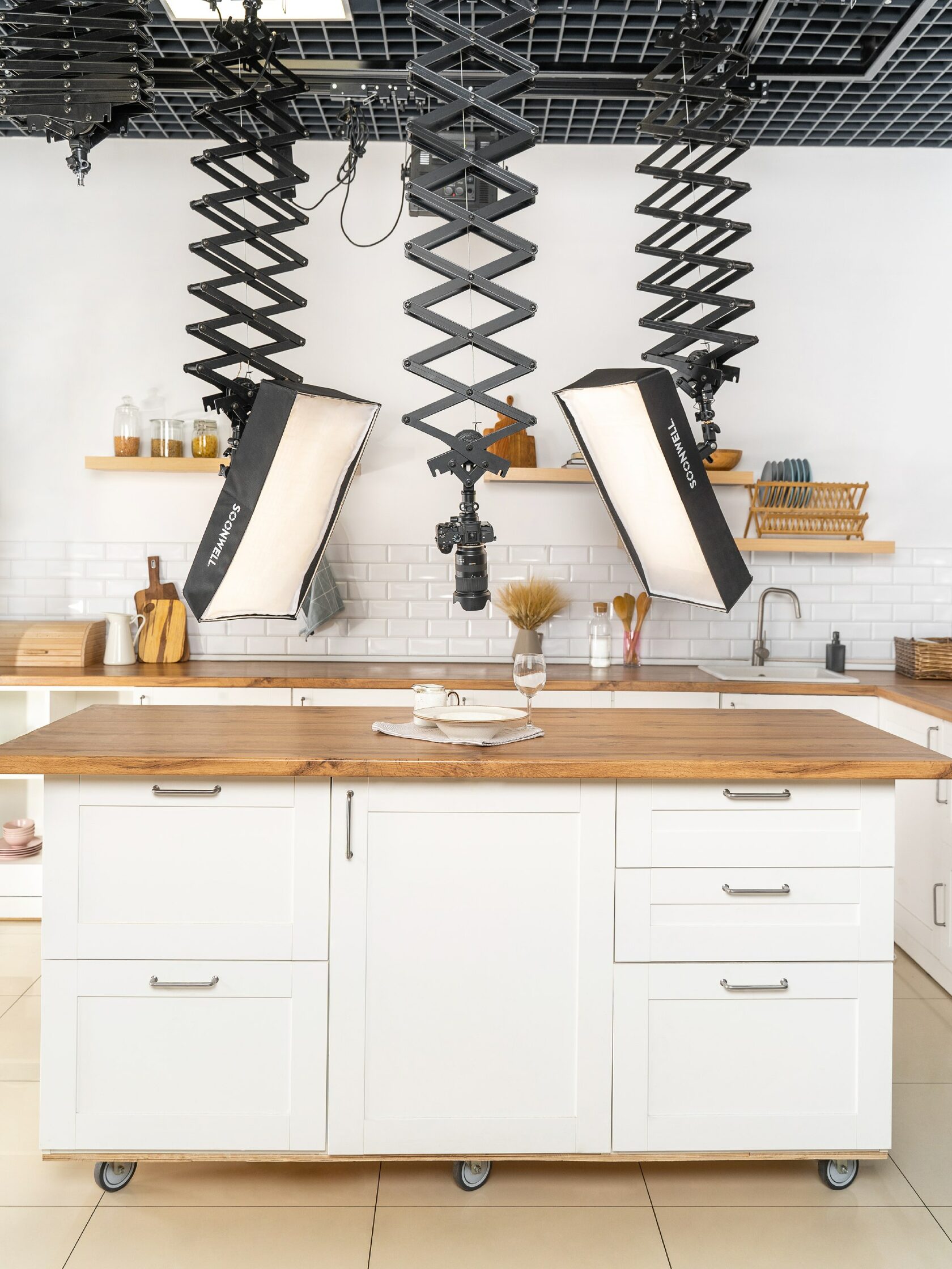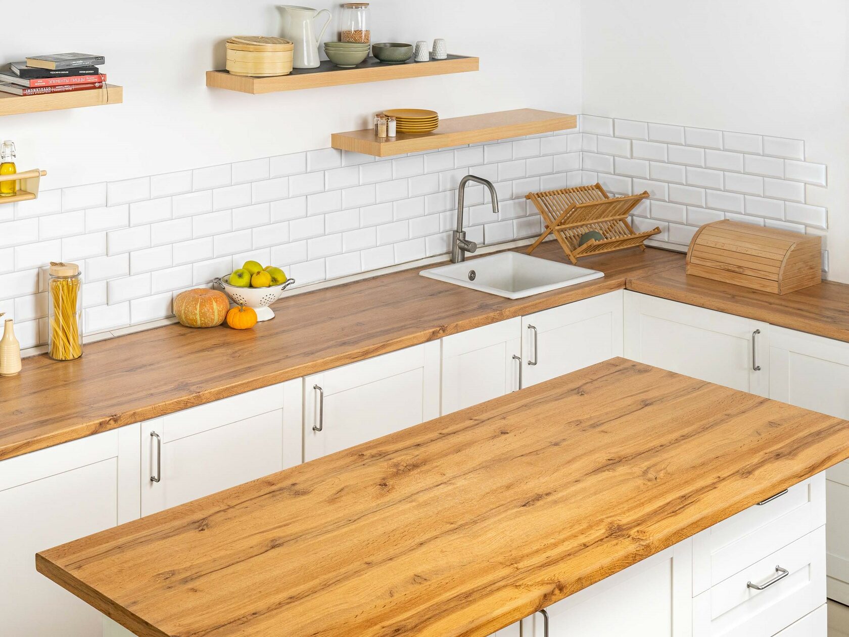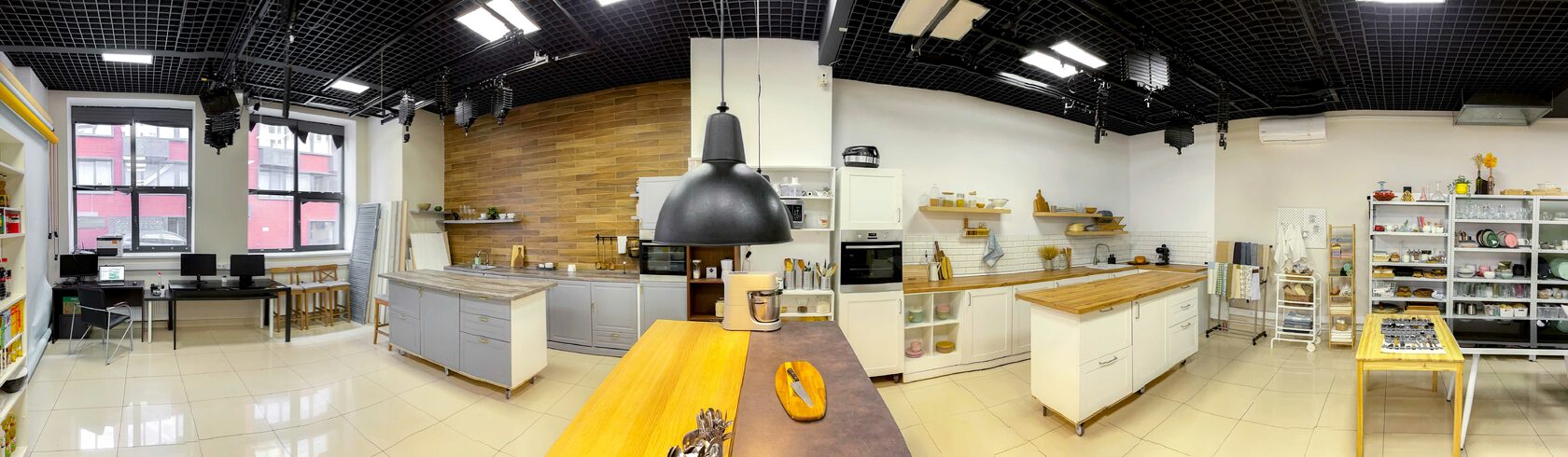 Светлая кухня с однотонными стенами, фартуком, фасадами белого цвета и столешницей из светлого дерева. Без лишних, отвлекающих деталей. Рабочая поверхность в виде кухонного “островка”, оборудованная под “table top”, микроволновая печь, духовой шкаф. Также отдельная закадровая зона для поваров с переносной индукционной плитой на 2 конфорки. Плита работает от электричества.