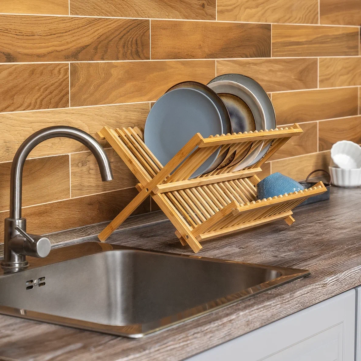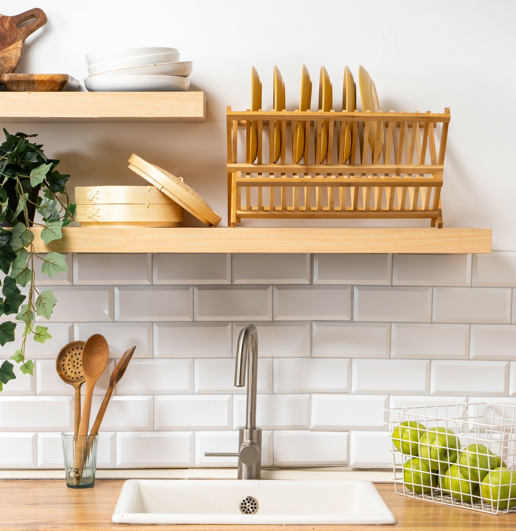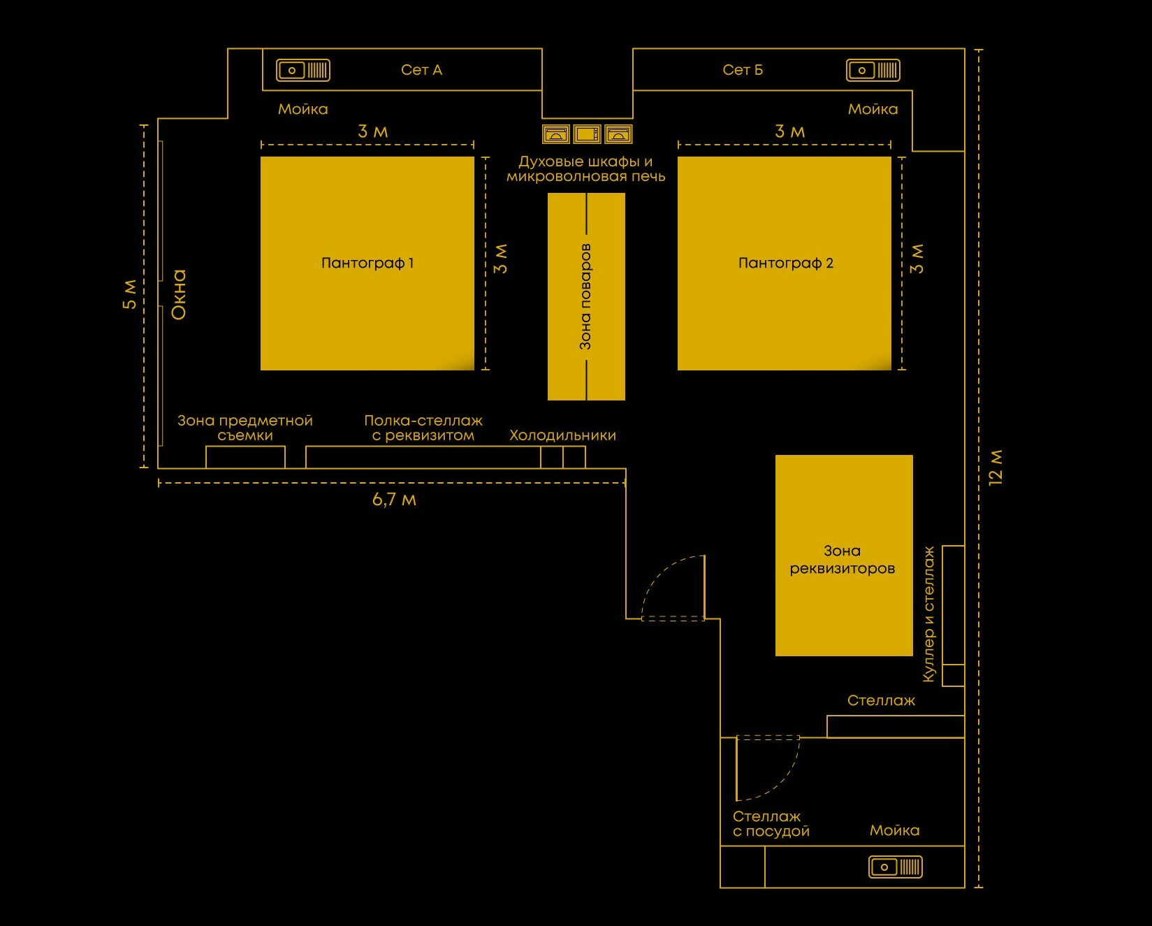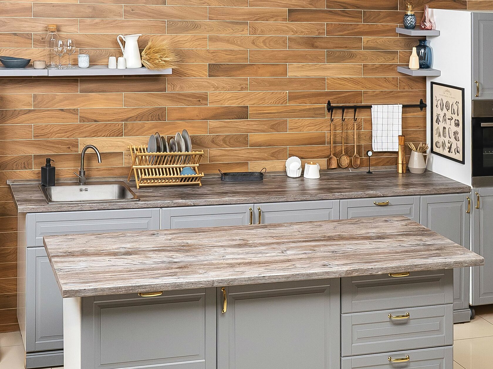 Светлая кухня с однотонными стенами, фартуком, фасадами белого цвета и столешницей из светлого дерева. Без лишних, отвлекающих деталей. Рабочая поверхность в виде кухонного “островка”, оборудованная под “table top”, микроволновая печь, духовой шкаф. Также отдельная закадровая зона для поваров с переносной индукционной плитой на 2 конфорки. Плита работает от электричества.